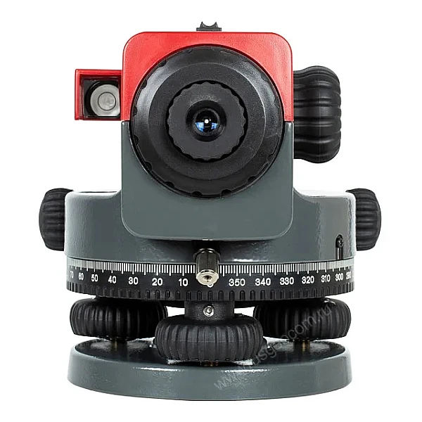 Корпус выполнен из прочного металла, а оптика надежно защищена от пыли и дождя по классу IPХ4. Нивелир окрашен в яркий красный цвет, что улучшает его заметность и стройплощадке и повышает безопасность съемки. Все регулировочные винты отличаются плавным и понятным ходом. Благодаря небольшому весу специалист может без устали перемещать устройство на протяжении всего рабочего дня. Предусмотрен визир для предварительной наводки.